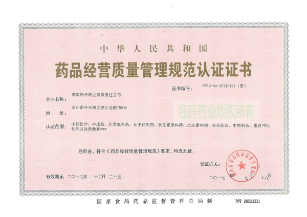 藥品經(jīng)營(yíng)質(zhì)量管理規(guī)范認(rèn)證證書